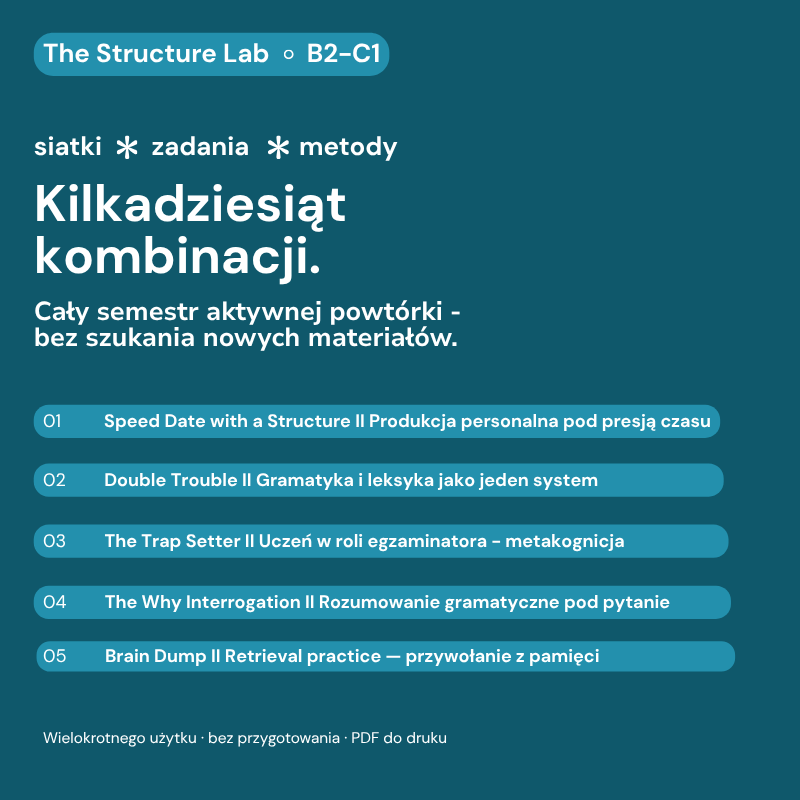 • 4 siatki gramatyczne – kluczowe struktury na poziomie B2–C1 ułożone pod kątem ćwiczeń retrieval i transformacji