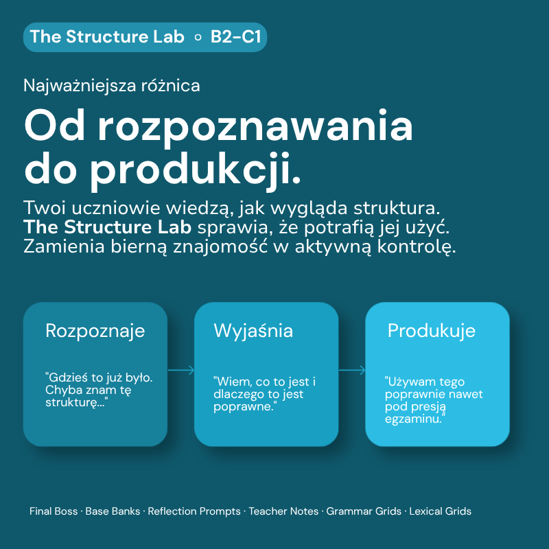 To kompletny system, który pomaga przejść od biernego rozpoznawania struktur do ich aktywnego opanowania. Nie przez mnożenie kolejnych ćwiczeń, ale przez lepsze zadania: takie, które wymagają od ucznia przywoływania z pamięci, wyjaśniania, łączenia elementów, przekształcania i pisania pod presją czasu, czyli dokładnie tak, jak robi to egzamin.
